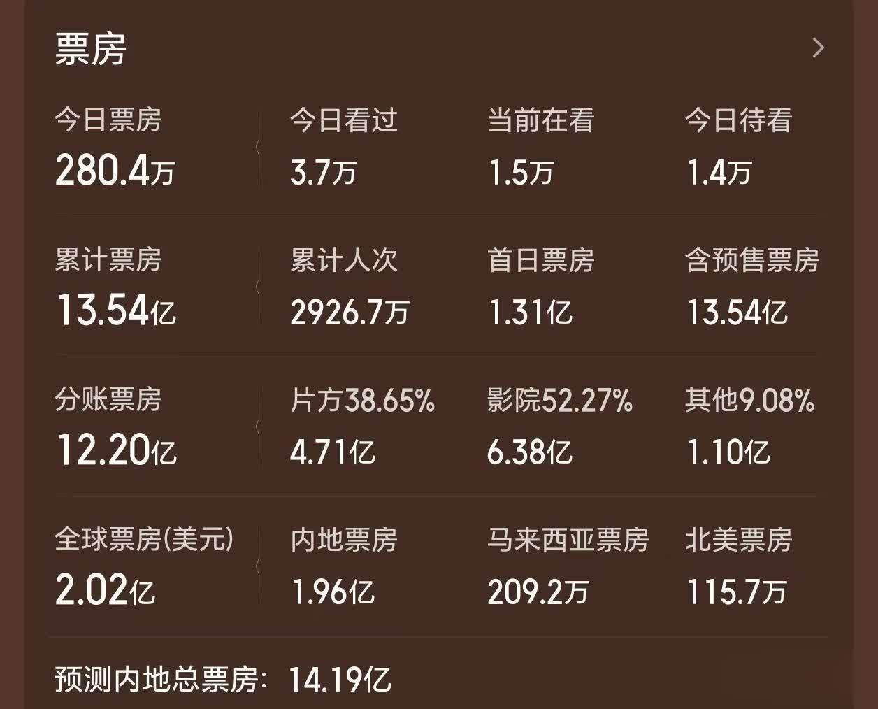 在中国内地以外,《镖东说念主》也有登陆中国香港、北好意思以及马来西亚等其他市集。加起来,该片当前的群众累计总票房达到了2.02亿好意思元,换算成东说念主民币接近14亿。