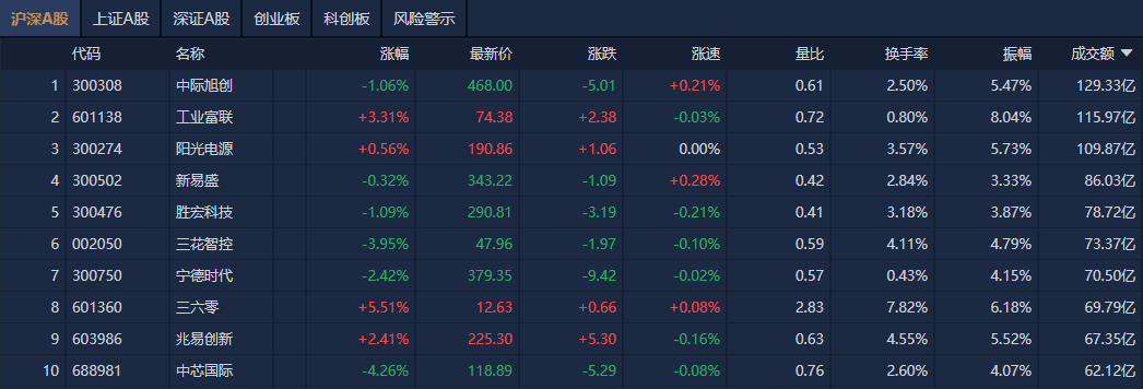 个股方面,中际旭创成交额超129亿元居首,工业富联、阳光电源、新易盛成交额靠前。