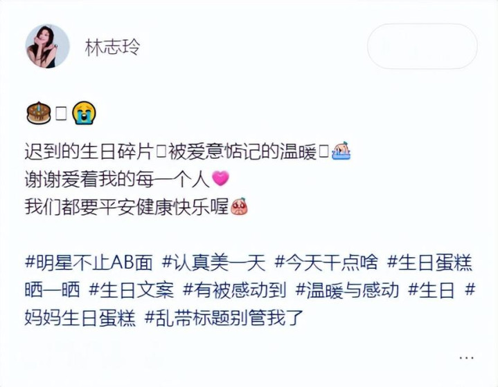 在12月3日晚上,林志玲在我方的应付平台上晒出了我方的庆生视频,不得不说团队确凿好有爱啊!订了一个十分大的蛋糕,让她感动到哭了,还配文:吃到的诞辰碎屑,被爱意惦念的温煦,拿着蛋糕许下了三个愿望。