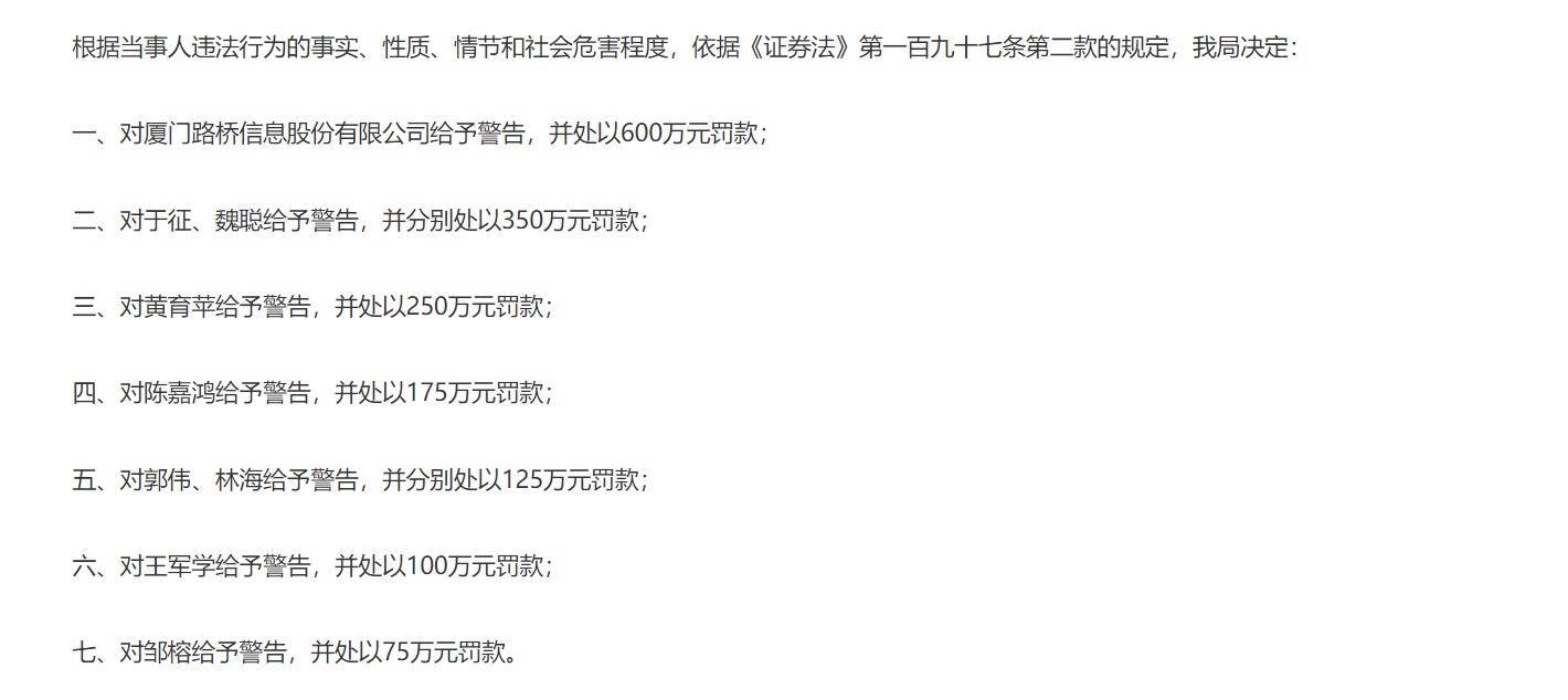 厦门证监局决定,对厦路途桥信息股份有限公司予以教诲,并处以600万元罚金;对时任董事长于征、时任董事兼总司理魏聪予以教诲,并鉴别处以350万元罚金,接管3年证券市集禁入措施。