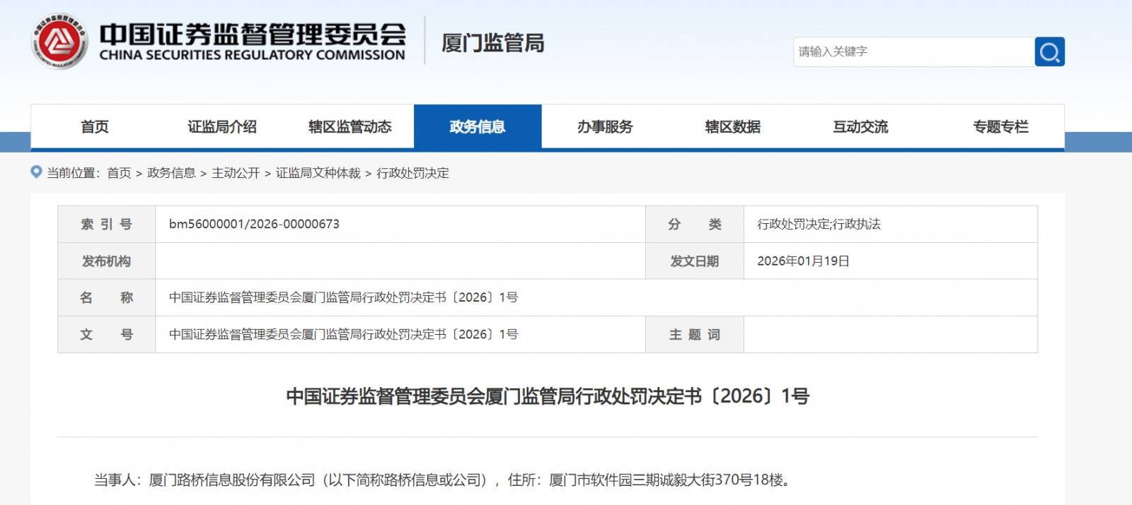 1月19日,因财务作秀,路桥信息(股票代码:920748)收到厦门证监局开年1号罚单。