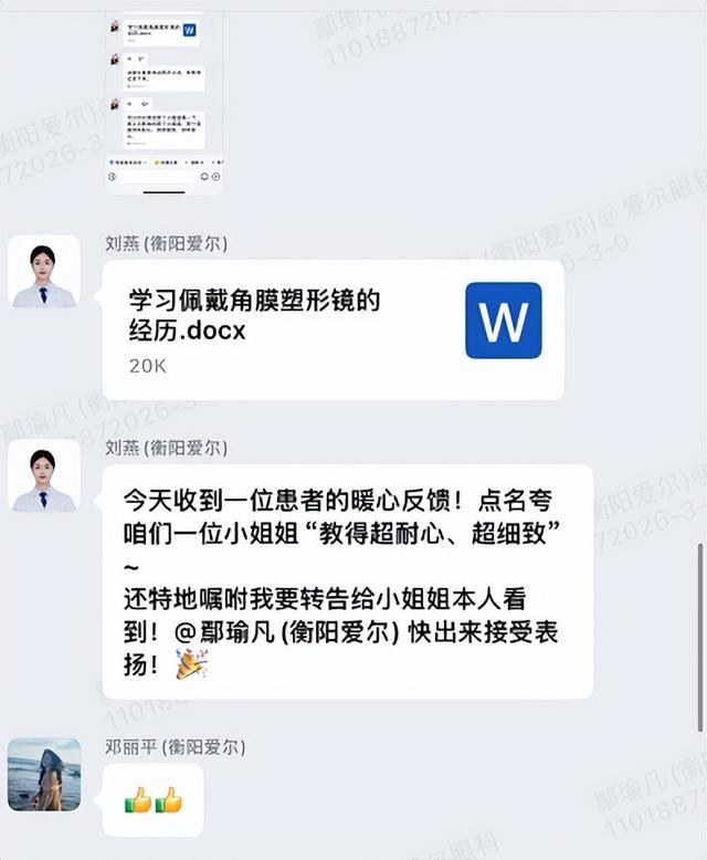 (▲收到家长的真诚响应后,职守医师第一技巧将这份招供共享至职责群,视光师鄢瑜凡成绩了来自团队的集体点赞)