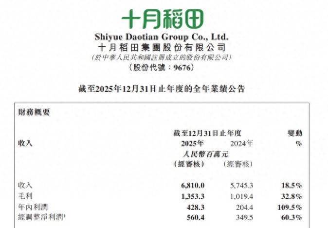 新京报讯(记者刘欢)十月稻田集团股份有限公司(简称“十月稻田”)近日发布2025年年报表露,呈文期内,该公司齐全总收入68.1亿元,同比增长约18.5%,经转机净利润(非国外财务呈文准则计量)为5.6亿元,同比增长约60.3%。